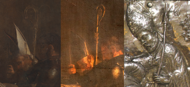 Il pastorale del vescovo del "Seppellimento di santa Lucia" di Caravaggio, inizialmente rivolto a destra come nelle copie più antiche di Caltagirone e Siracusa